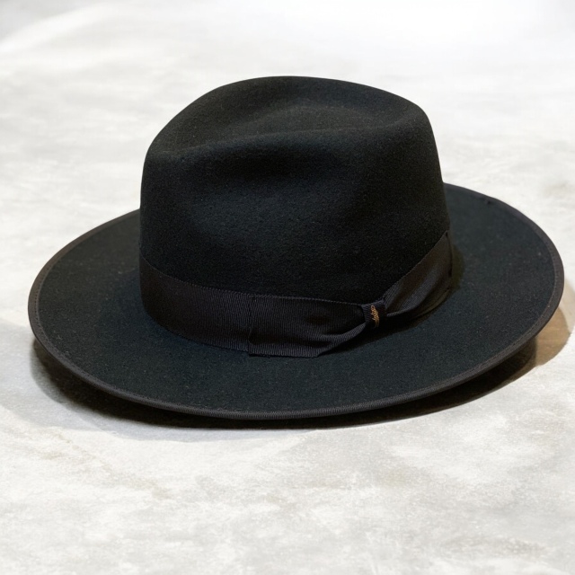 ビンテージ風の Vシルエットと呼ばれる角ばった感じのクラウンとつば先を巻いたグログランが印象的な帽子 頭頂の膨らみがありクラウン幅があるため、