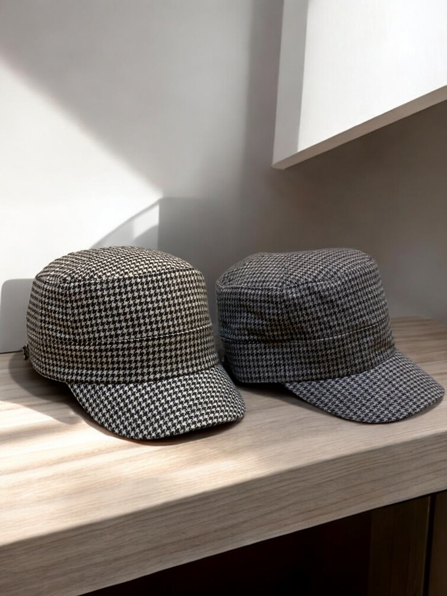 カジュアルなワークキャップの形をベースに上品な千鳥格子で仕上げています。 ほどよいつばの長さで顔周りの日差しをカットしつつすっきりしたシルエットに。 カジュアルなデニムやチノパンはもちろんシックなコートスタイルの外しアイテムとしても活躍してくれます。