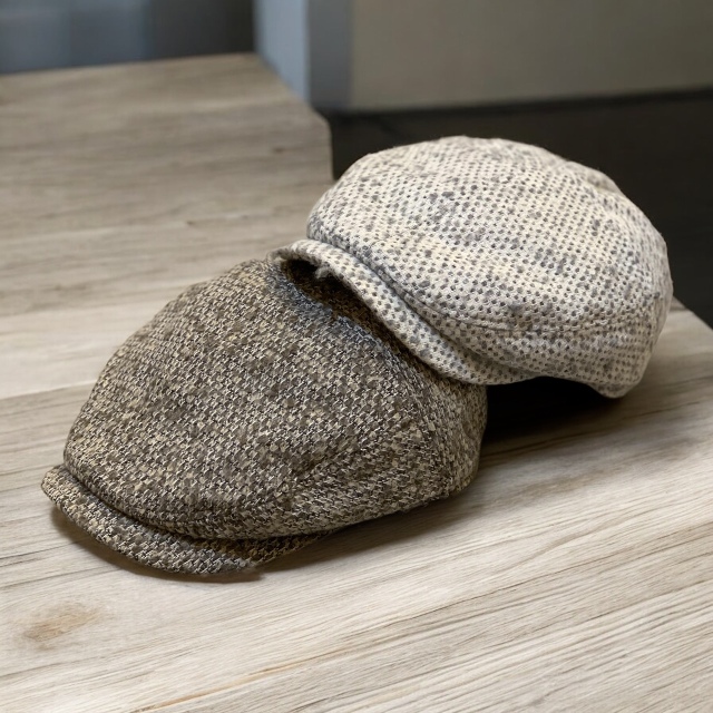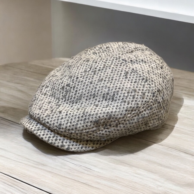 細かな凹凸のあるツイード調ウールで仕立てたハンチング。 グレー系とブラウン系の糸をミックスすることで小石(ペブル)のような砂目の表情を出し無地よりも奥行きのある雰囲気に仕上げています。 裏側にはサイズ調節機能付きでフィット感の微調整も簡単。 デイリーカジュアルからきれいめスタイルまで幅広いコーディネートに使用できます。