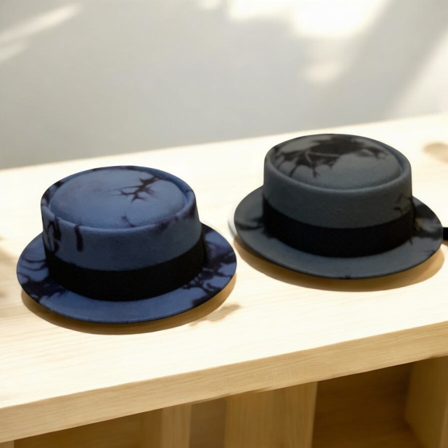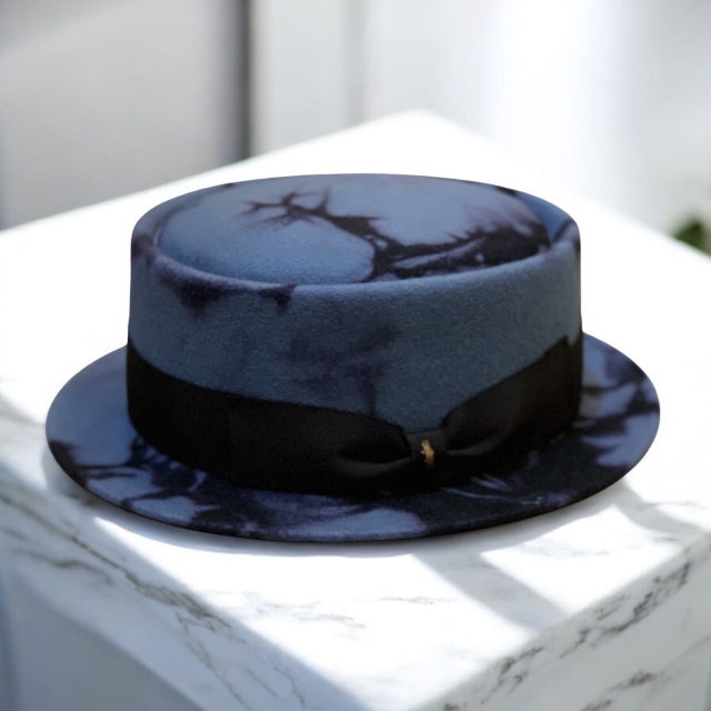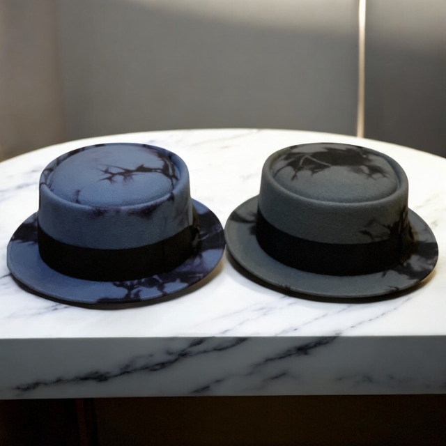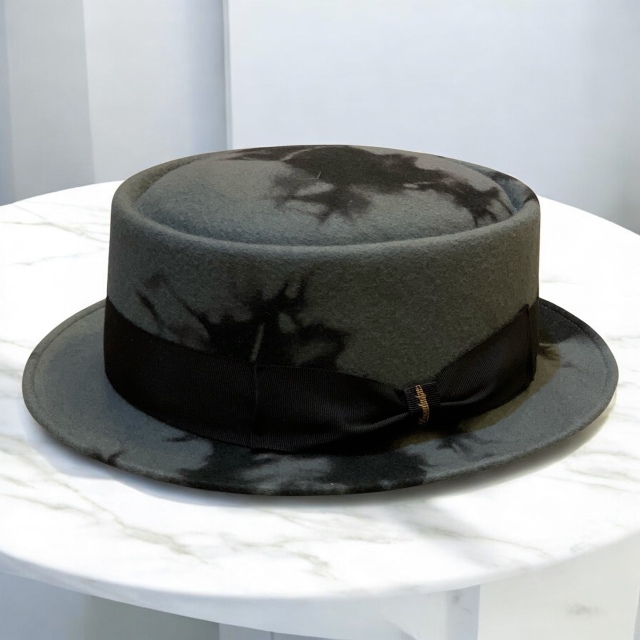 高品質のウールフェルトに影がにじむような独特の染めを施したポークパイハット。 一つ一つ違う表情を持つ影染めがシンプルなフォルムに奥行きを与え 高級感のある佇まいに仕上がっています。