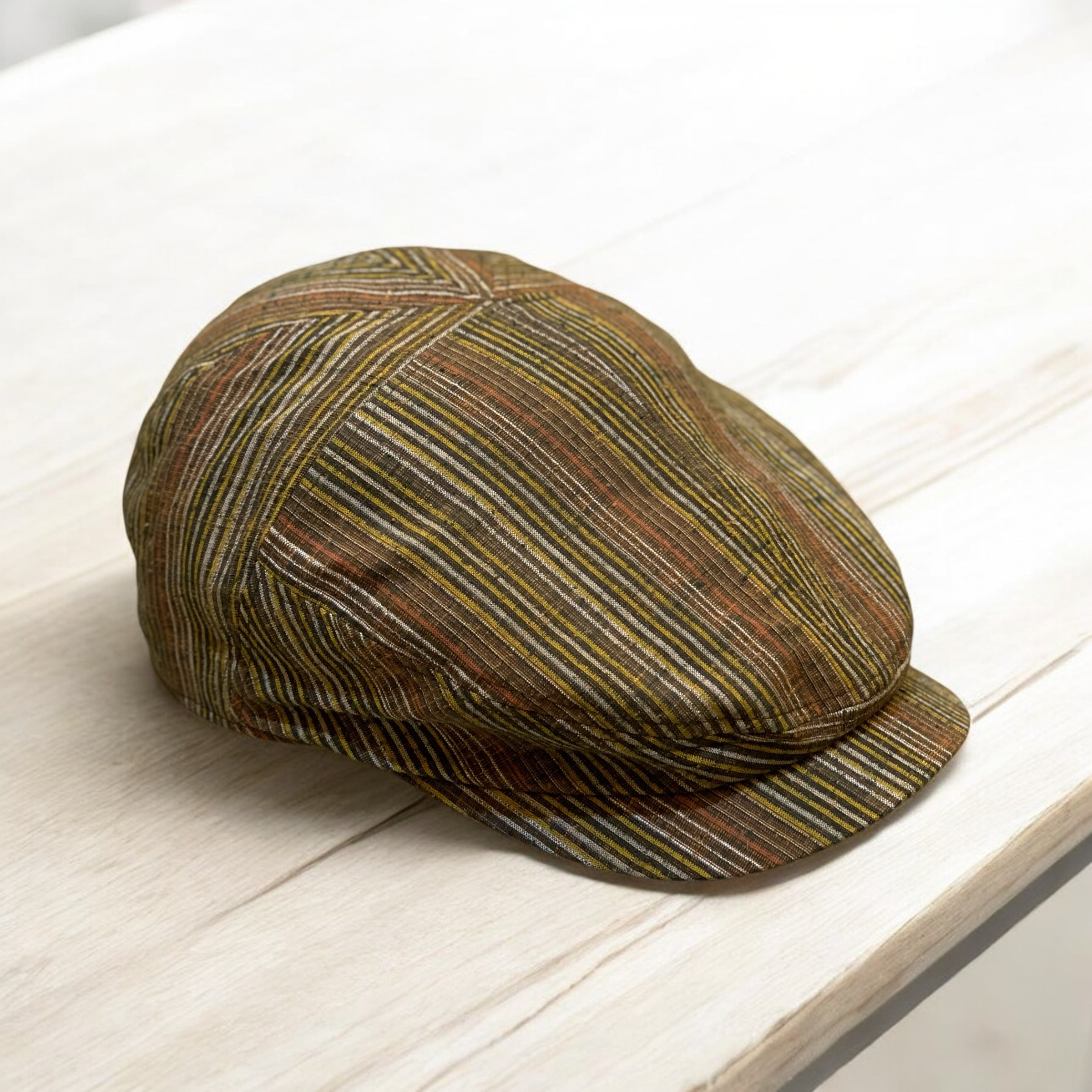 伝統的な着物生地を贅沢に使用したハンチング。 落ち着いたブラウンを基調に、縦縞の織柄がモダンな雰囲気を演出しています。 和の趣を残しながらも洋装に自然になじむデザインで日常使いはもちろん特別の日の装いにも。 プレゼントにもおすすめです。 型はKNOWLEDGE定番の型を使用し老若男女問わず、 様々な型に愛されているハンチングです。